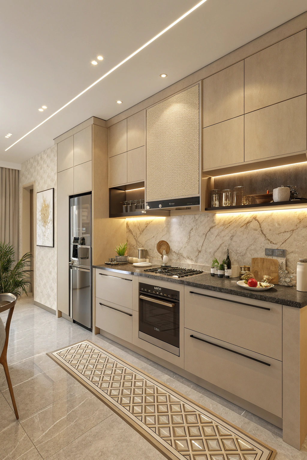 A contemporary beige kitchen radiates sophistication while maintaining a sense of warmth and comfort. You can enhance this space with sleek cabinetry, stainless steel appliances, and subtle textures. Consider pairing beige walls with darker countertops for contrast. Incorporate warm lighting to create an inviting atmosphere, and choose stylish accessories that complement the beige palette. This combination fosters a welcoming yet stylish cooking environment.