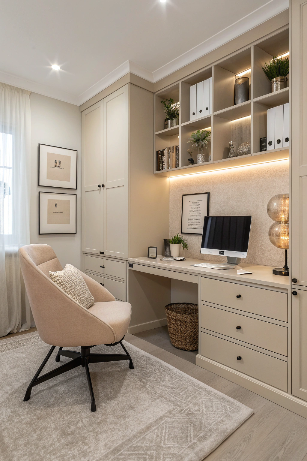 Transforming a spare room into a chic beige home office can boost your productivity while providing a serene atmosphere for focused work. Choose a soft beige for the walls and complement it with sleek, modern furniture in matching tones. Add a stylish desk, ergonomic chair, and minimalist decor. With adequate lighting and organized storage, you'll create an inspiring space to tackle your tasks efficiently.