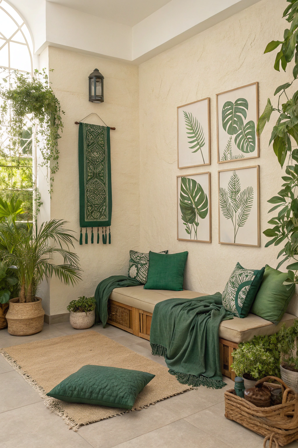 When you combine beige and green, you can cultivate an invigorating and balanced environment that naturally promotes relaxation and creativity. To enhance this harmony in your space, consider these ideas: