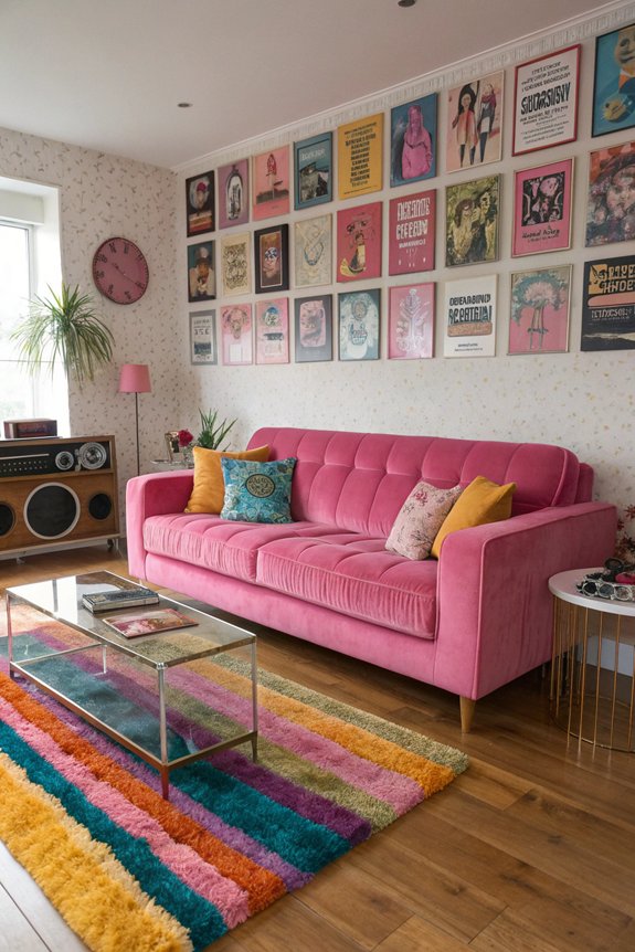 To transform your Y2K living room into a vibrant and inviting space, layer your floors with fun rugs that reflect the era's eclectic style. Consider these options to elevate your decor: